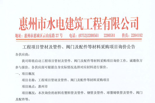 惠州市水電建筑工程有限公司成立于一九六四年四月,隸屬惠州市水務(wù)集團(tuán)有限公司,是一家國(guó)有綜合性施工企業(yè),主營(yíng)水利水電工程、房屋建筑、市政工程等施工業(yè)務(wù)。公司擁有水利水電工程施工總承包一級(jí)、建筑工程施工總承包一級(jí)、市政公用工程施工總承包一級(jí)、公路工程施工總承包三級(jí),公路路基、路面及建筑裝修裝飾專(zhuān)業(yè)承包二級(jí),環(huán)保工程、機(jī)電安裝、河湖整治、輸變電工程專(zhuān)業(yè)承包三級(jí)等經(jīng)營(yíng)資質(zhì)……